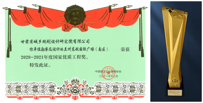 甘肃省城乡规划设计研究院勘察、设计的“兰州东航国际广场(南区)项目”荣获“2020—2021年度国家优质工程奖”。此前,该项目已荣获2020年工程建设项目绿色建造设计水平评价三等成果、2020年度甘肃省优秀工程勘察设计三等奖等多项荣誉。